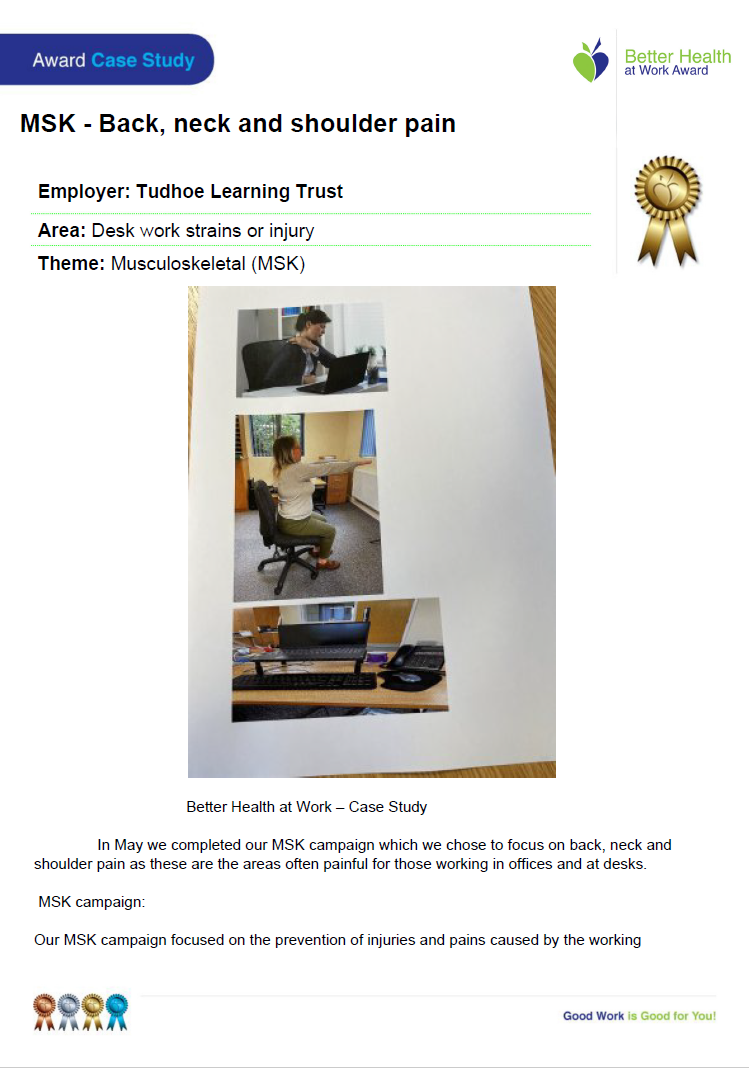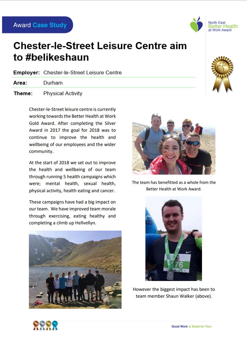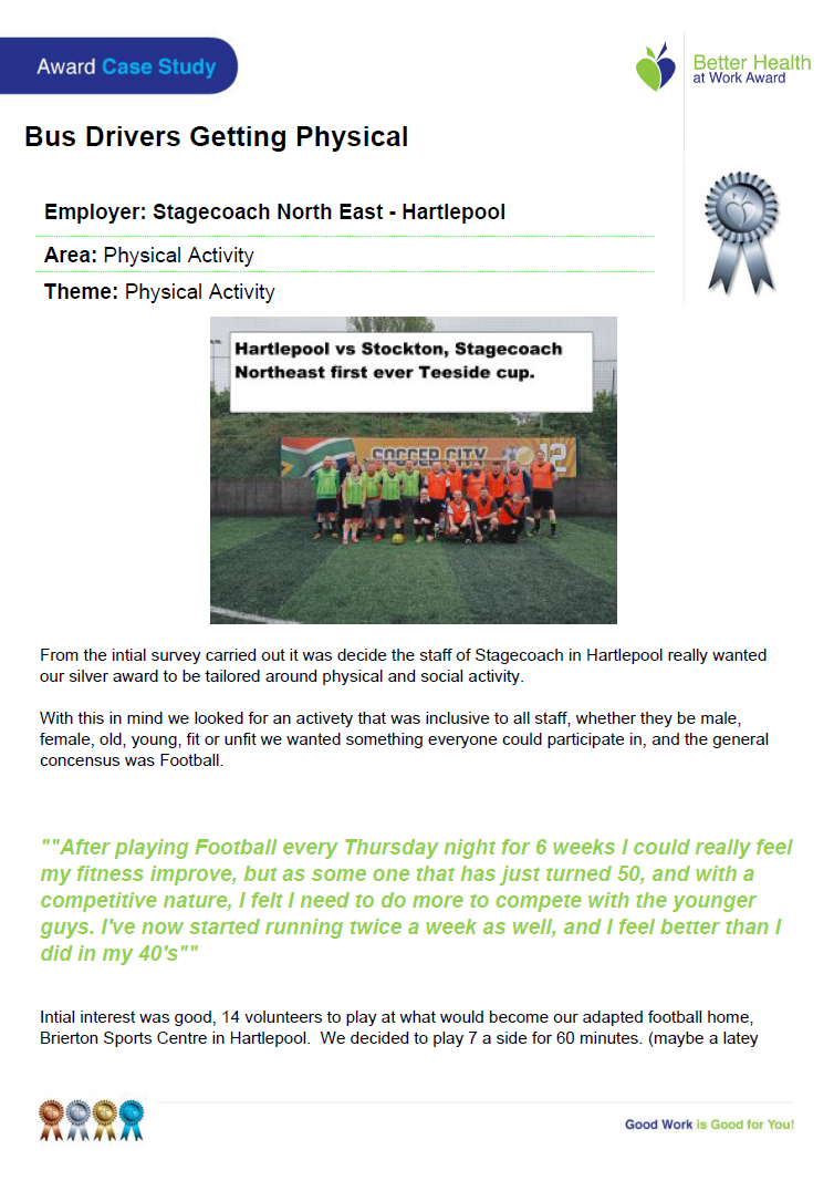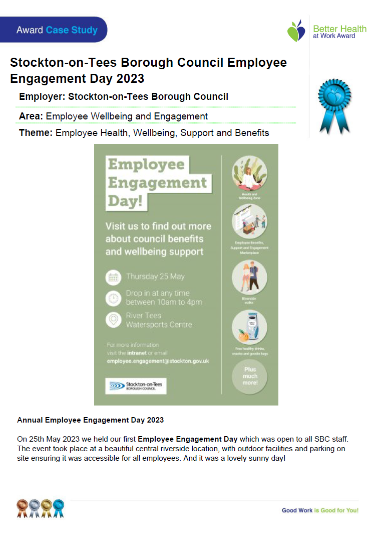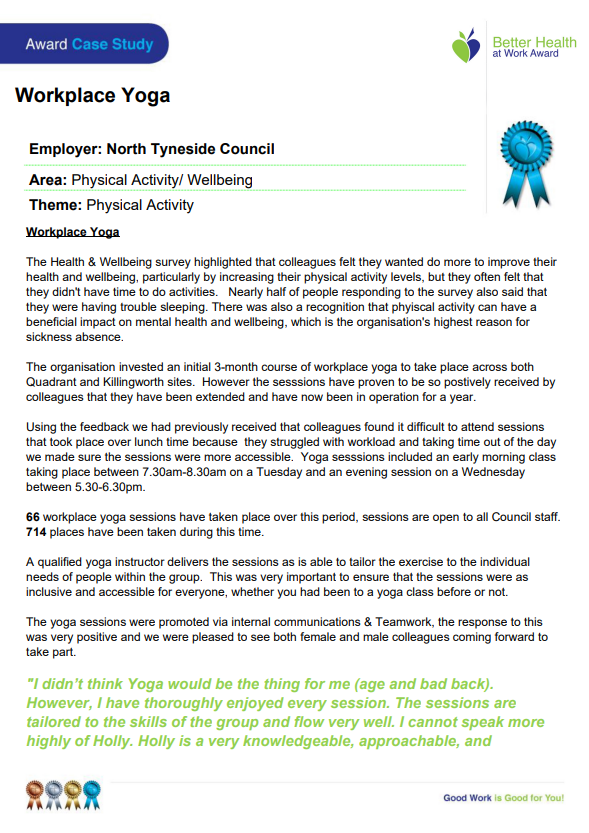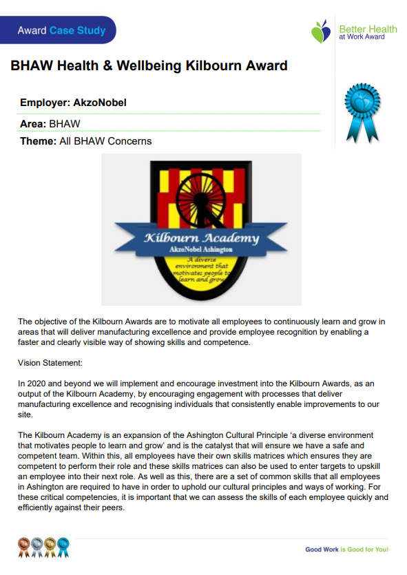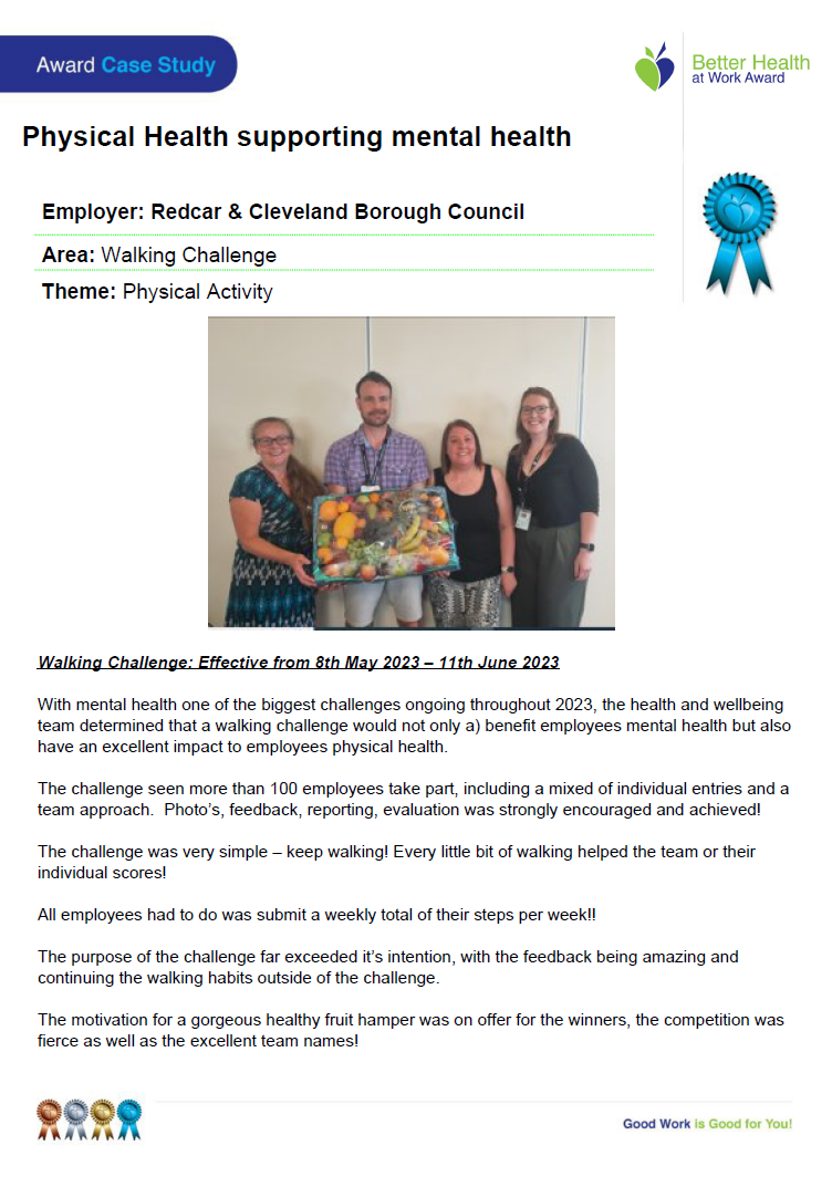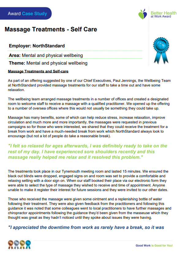 We chose to participate in the award programme as it is providing us with a structured and planned schedule of events and initiatives that supports our overarching health and wellbeing strategy and objectives. It is a key strand to use providing a holistic approach to our employees’ health and wellbeing.