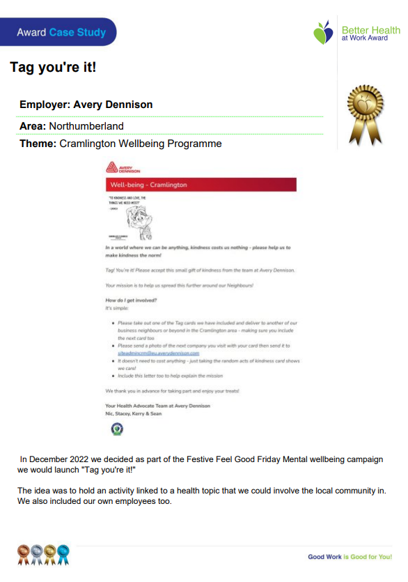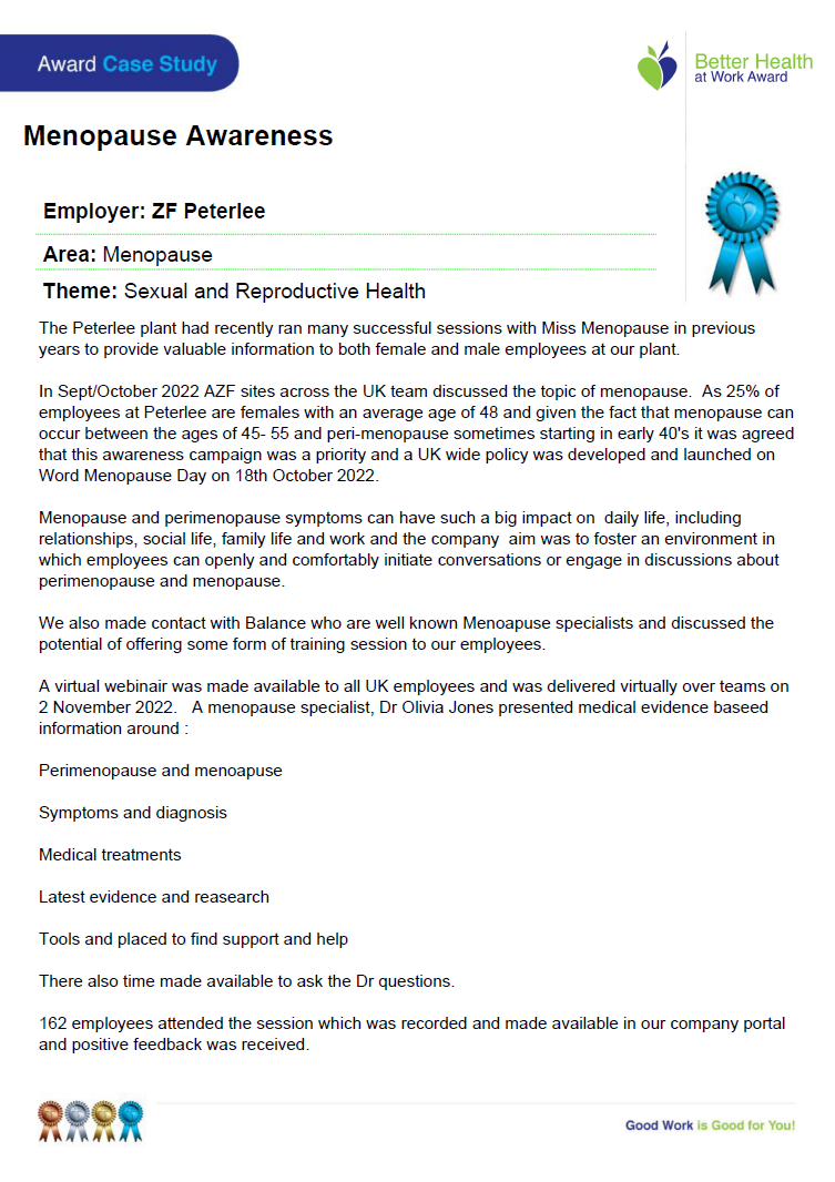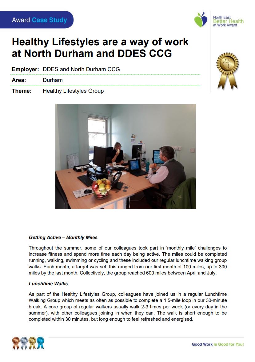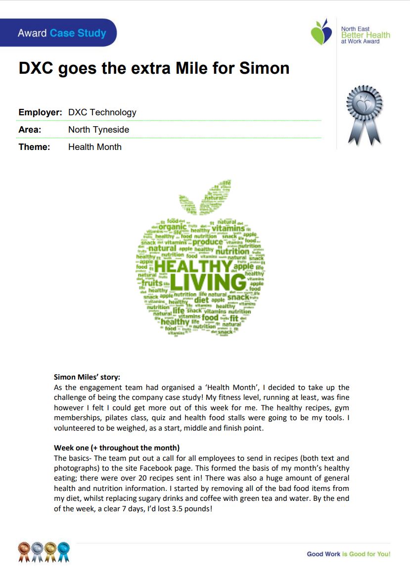 The award programme has provided us with key benefits including pointers in data gathering, event planning and networking opportunities. The monthly health advocate meetings are invaluable in providing information on what local support is available to enable us to build up our calendar of events and provide relevant and engaging content to our employees on a variety of health topics.