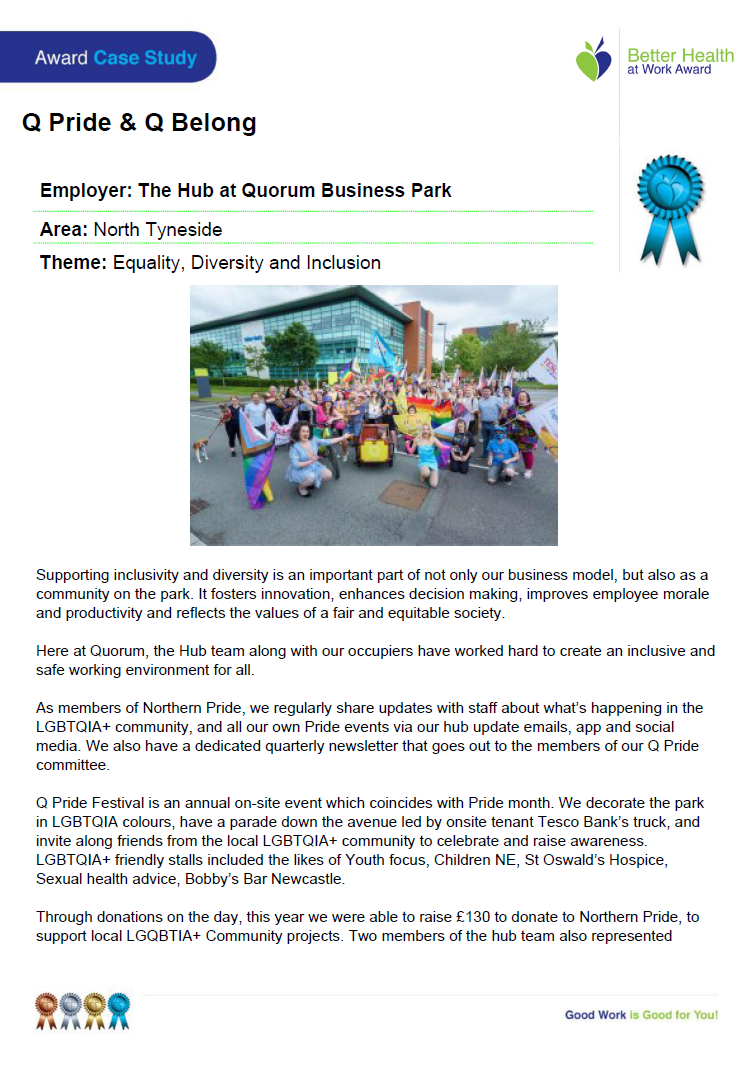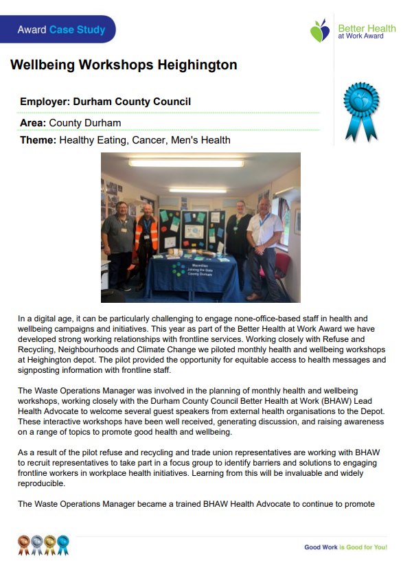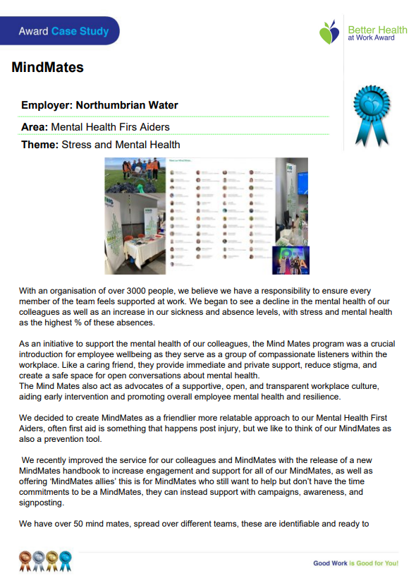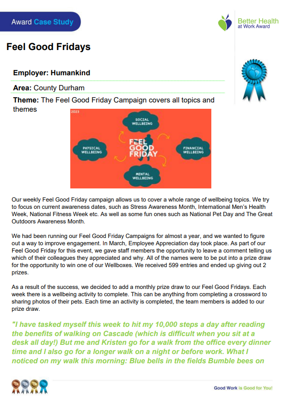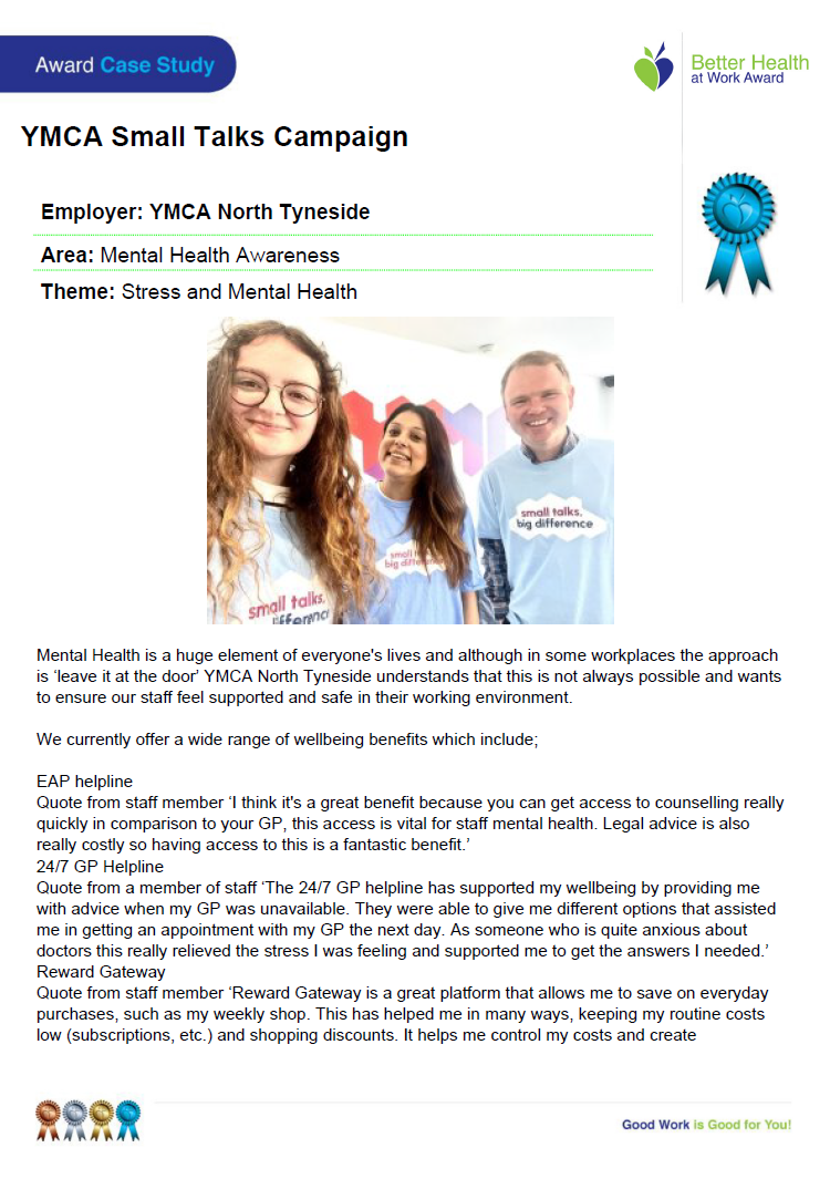 The Award has been a great motivator, helping us focus our wellbeing efforts and create meaningful activities for staff. The advice and resources provided have been invaluable in shaping our campaigns and engaging our team in positive, lasting change".