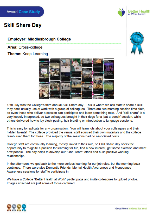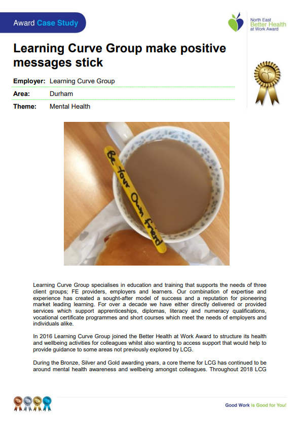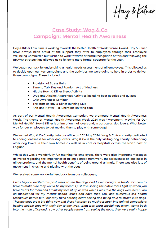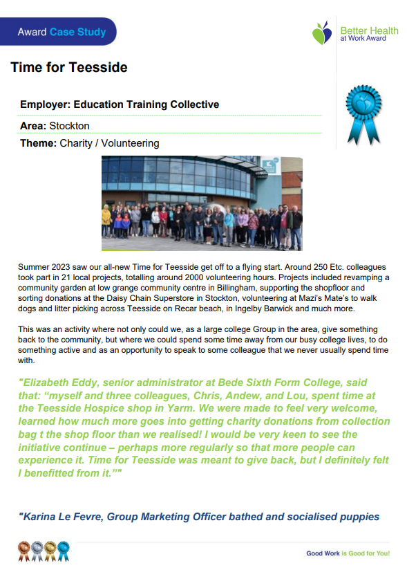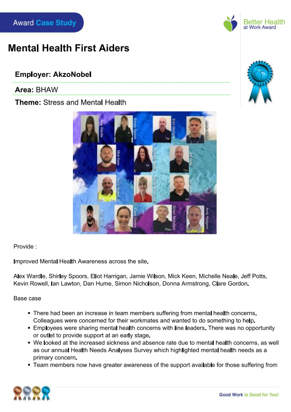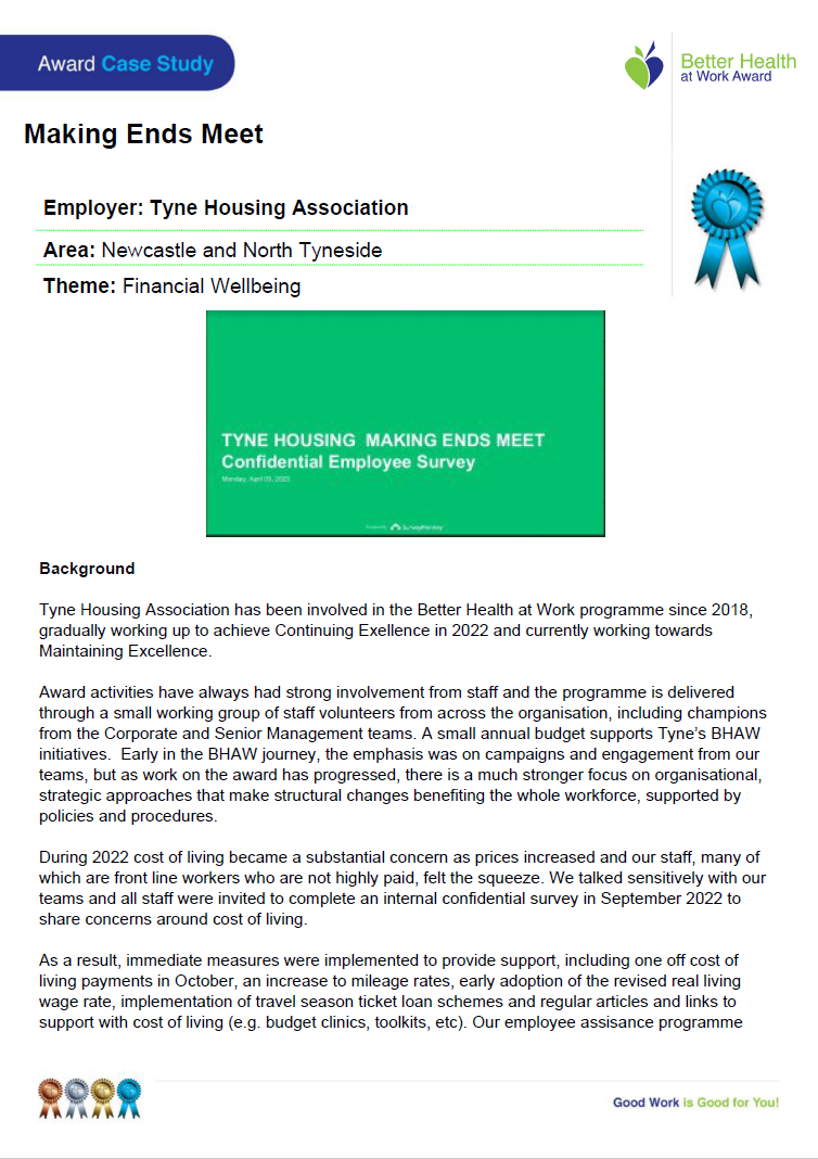 The Award has been a great motivator, helping us focus our wellbeing efforts and create meaningful activities for staff. The advice and resources provided have been invaluable in shaping our campaigns and engaging our team in positive, lasting change".