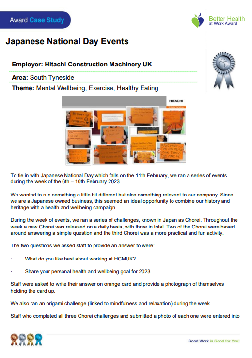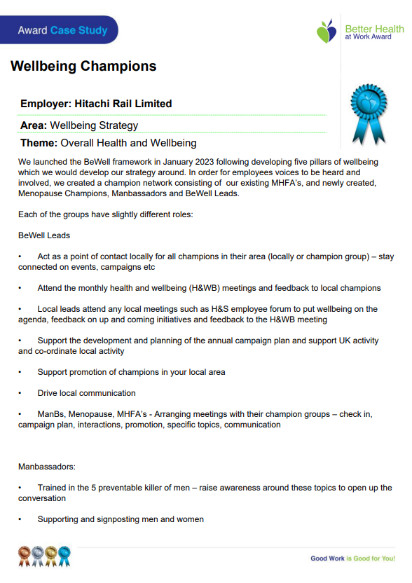 We are excited to be part of this programme and look forward to progressing through the differing levels to provide real benefit to our workforce. This will ensure we continue to put health at the heart of Hitachi.